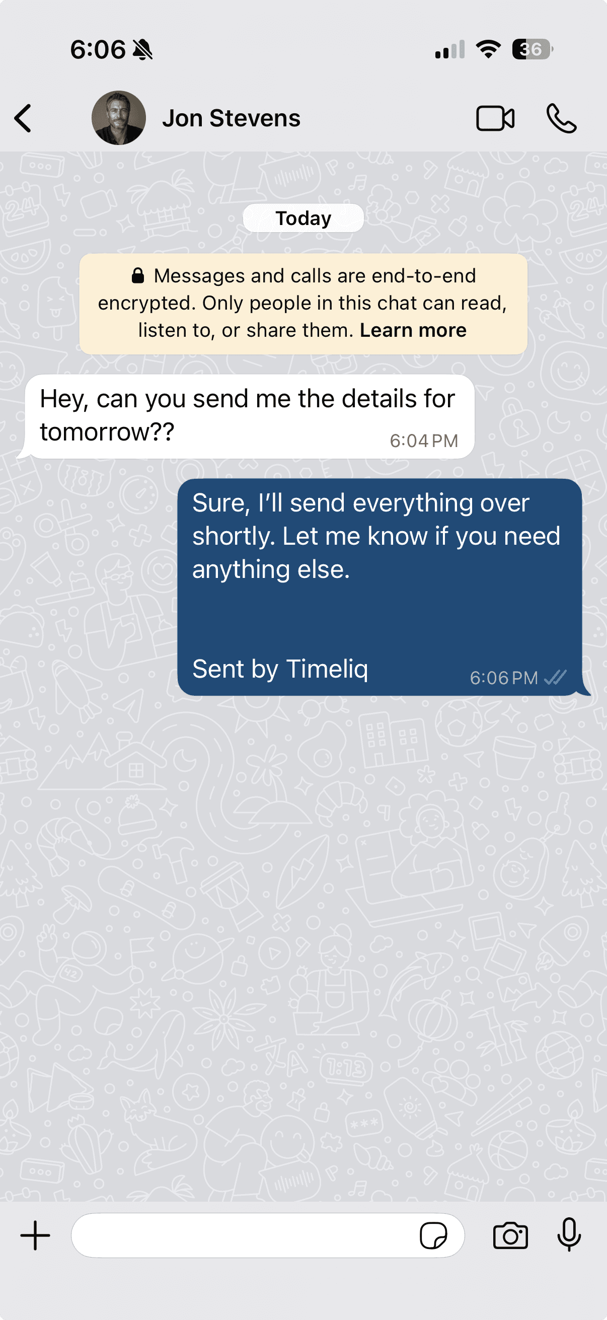 Send fast, natural responses automatically. Timeliq understands the context and replies in your tone — even when you’re busy or away.